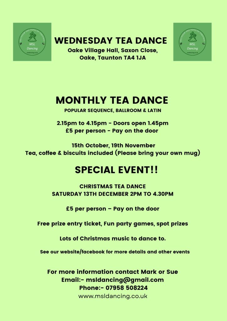 Sunday Tea Dance. TEA DANCE 2nd NOVEMBER 2025 at Creech St Michael Taunton at 2pm – 4.15pm. Dress code:-Smart Casual – relax and enjoy, Raffle for our Charity Freewheelers check out the Events Calendar, Ballroom and Popular Sequence Dancing and refreshments Tea/Coffee and Biscuits and Cake (Please bring your own Mug )