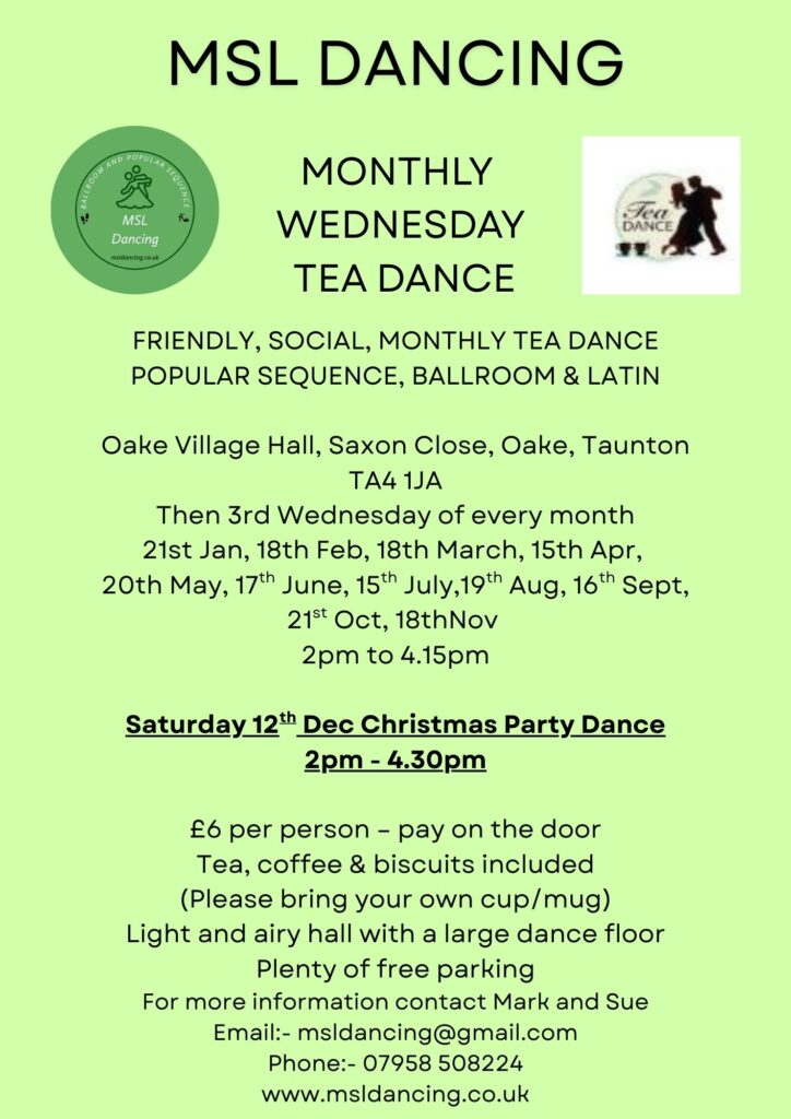 WEDNESDAY 21st JANUARY DANCE -2.15pm to 4.15pm MONTHLY WEDNESDAY TEA DANCE, Oake Village Hall, Saxon Close, Oake, Taunton TA4 1JA Friendly , Social , Tea Dance with Popular Sequence, Ballroom and Latin Dancing. Please bring your own mug) Then 3rd Wednesday of each month