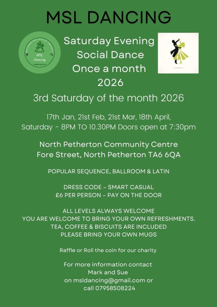 Saturday Evening social dance with Tea and Biscuits and a Raffle.. 17th January 2026 North Petherton Community Centre Taunton, on Saturday Evening £6pp, 8pm – 10.30pm Ballroom, Latin & Popular Sequence. Events Calendar A great evening of Fun , lots of dancing and Large raffle with great prizes , Social dancing, supporting our local charity.