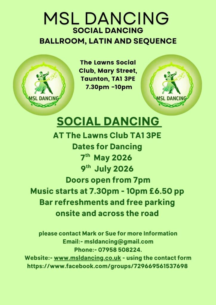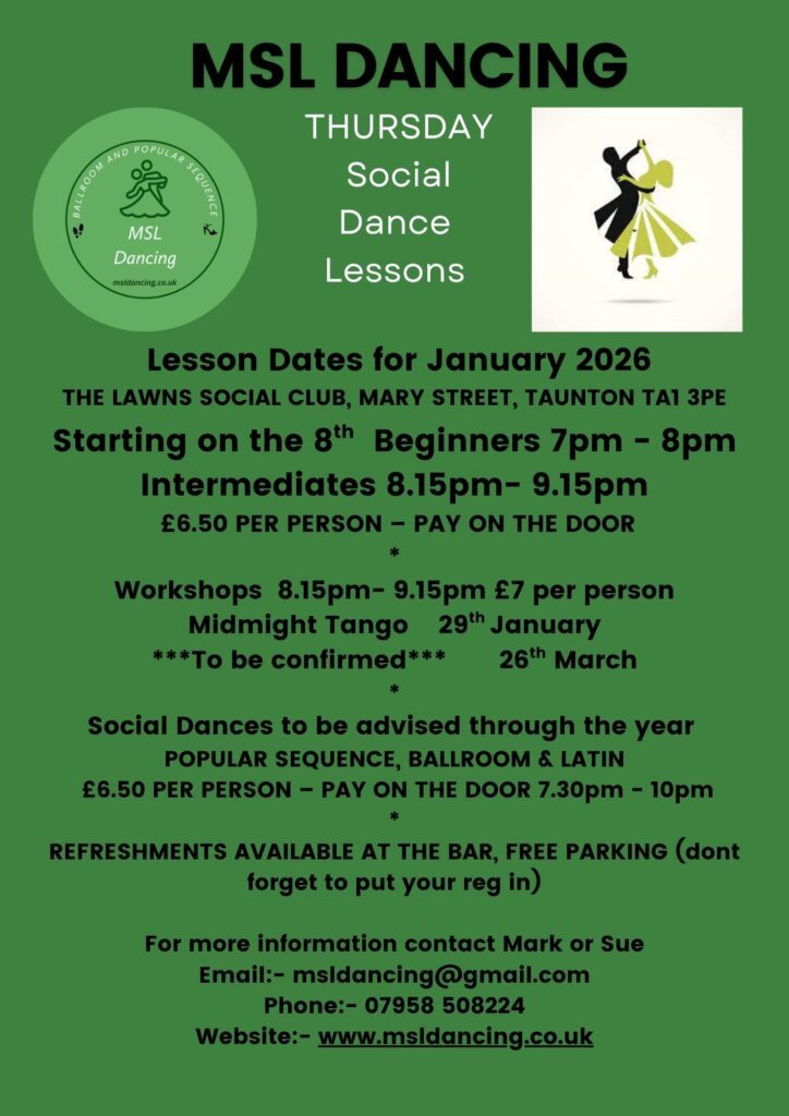 ——-IMPROVERS SEQUENCE DANCE LESSONS , at West Buckland Village Hall 1 Silver St, West Buckland, Wellington TA21 9NA, IMPROVERS START BACK ON THE 7th JANUARY 2026 WEDNESDAY- 8pm To 9pm – £6:50 PER PERSON – PARTNER REQUIRED – Pay on the door Come along and learn some popular sequence dances. – For more details and to book a place please contact Mark or Sue Email:-msldancing@gmail.com Phone:- 07958 508224 Website:- www.msldancing.co.uk.