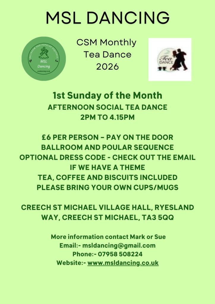 Sunday Tea Dance. TEA DANCE 1st FEBRUARY 2026, ******, OPTIONAL DRESS CODE SMART CASUAL at Creech St Michael Taunton at 2pm – 4.15pm. Dress code:-Smart Casual – relax and enjoy, Raffle for our Charity Freewheelers check out the Events Calendar, Ballroom and Popular Sequence Dancing and refreshments Tea/Coffee and Biscuits and Cake (Please bring your own Mug )