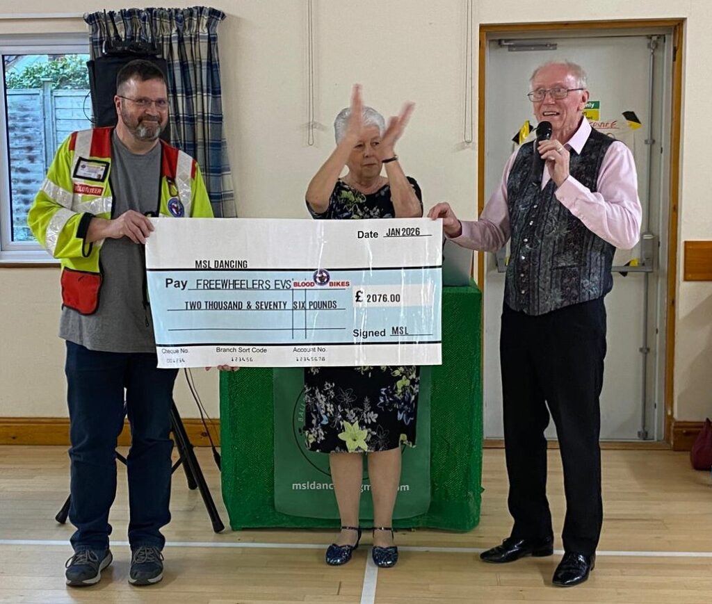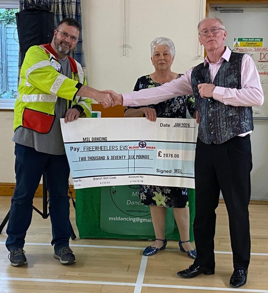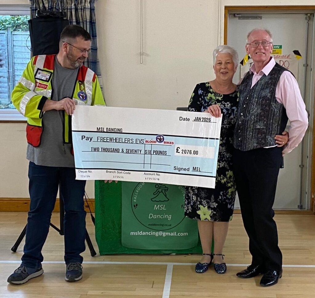 Our presentation of a Cheque for £2076.00 to EVS Freewheelers Blood Bikes Charity. January 2026 this is what our dancers have achieved thorough out the year with Donations, Raffles and Roll the Coin. This is a big Thank you to all who have supported us through out the year from Mark & Sue